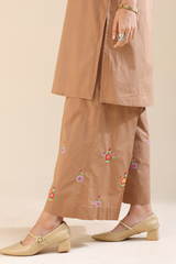 Hand-embroidered classic-fit shirt featuring a low band neckline with a V-slit, finished with colorful stitching along the neckline and sleeve hems. Paired with hand-embroidered culottes for a coordinated, refined look.