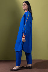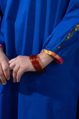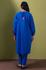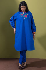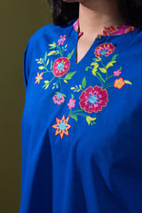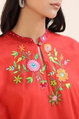 Hand-embroidered relaxed-fit shirt with a low band neckline and V-slit, featuring vibrant embroidery on the bodice, sleeves, and back. Designed with cuffed sleeves for a polished finish. Paired with straight-fit trousers for a timeless look.