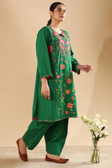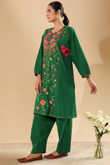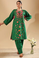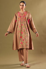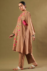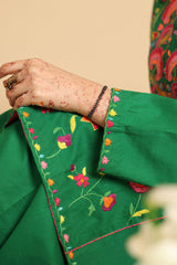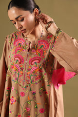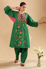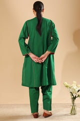Hand-embroidered paneled kurta with a round neckline and button detailing along the front slit. Vibrant embroidery enhances the silhouette. Paired with a classic fit shalwar, finished with refined stitching accents along the borders.