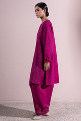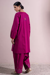 An embroidered paneled shirt with a round neckline and a V-slit, adorned with tassel detailing and finished with subtle cuffed sleeve hems. Paired with an embroidered classic-fit shalwar for a cohesive, refined look.