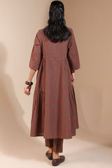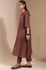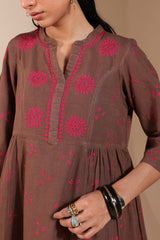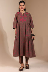 Hand-embroidered classic-fit tiered frock with a low band neckline and V-slit, featuring gathered tiers for a flared silhouette. Paired with straight-fit trousers for a graceful look.