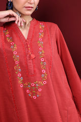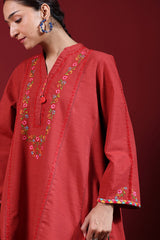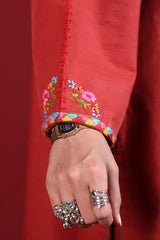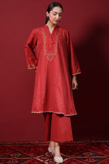 Hand-embroidered paneled kurta featuring a low band neckline with a V-slit, adorned with tassel detailing. Delicate hand-embroidered motifs add an artisanal touch, enhanced with colorful embroidery along the sleeves and rounded shirt hem. Paired with classic culottes for a refined look.
