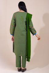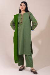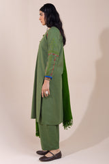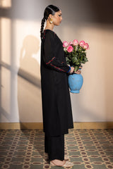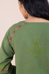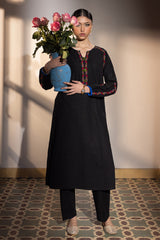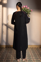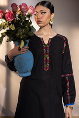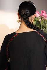 Handcrafted embroidered classic-fit shirt with a round neckline and V-slit, adorned with tassel detailing. Drop-shoulder style with cuffed sleeves, paired with straight-fit trousers.