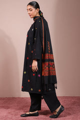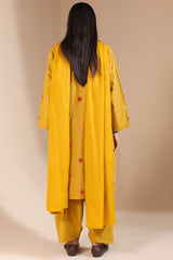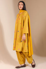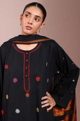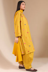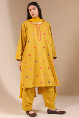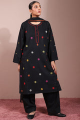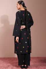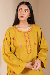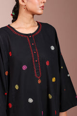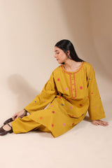 Hand-embroidered paneled kurta with a round neckline and buttoned front placket. Paired with a classic-fit shalwar for a chic look.