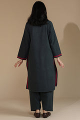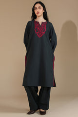 Hand-embroidered classic-fit shirt with a round neckline and a V-slit, adored with vibrant embroidered detailing. Paired with a classic-fit shalwar for a refined silhouette.