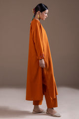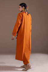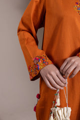Hand-embroidered classic-fit shirt with a round neckline and V-slit, adorned with delicate embroidery detailing. Playful tassel accents add interest at the side slits. Paired with straight-fit trousers.