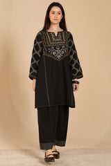 Hand-embroidered paneled kurta with a round neckline and V-slit, adorned with vibrant embroidered detailing. Paired with a classic-fit shalwar, finished with embroidered accents.