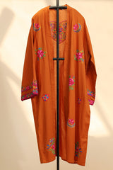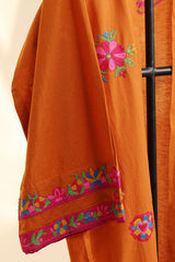 Belted embroidered jacket designed with relaxed shoulders, an open front, wide sleeves, and a matching belt, accented with embroidery along the sleeve hems.