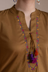 Embroidered paneled shirt with a low band neckline and v slit adorned with tassel detailing. Paired with straight-fit trousers for a refined, elegant look.