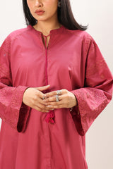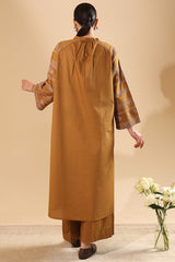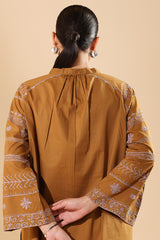 Embroidered classic-fit shirt with a low band neckline and V-slit, adorned with tassel detailing. Designed with relaxed shoulders and back pleats for added comfort. Paired with coordinated culottes.