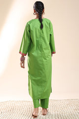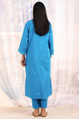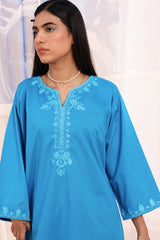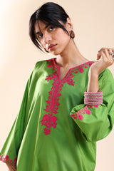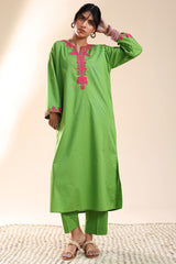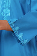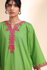 Embroidered classic-fit shirt with a round neckline and V-slit, adorned with delicate embroidery along the neckline and sleeve hems. Paired with straight-fit trousers.