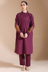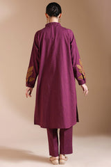 Appliquéd classic-fit shirt with a low band neckline, adorned with delicate stitching detail and a buttoned front placket. The cuffed sleeves features appliqué and embroidered work, finished with crochet lace along the hems. Paired with speckled straight-fit trousers.