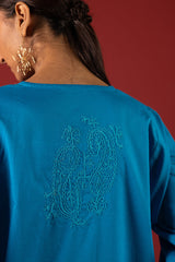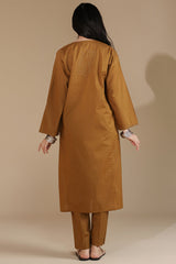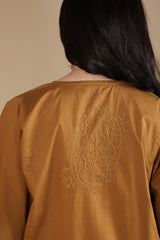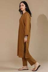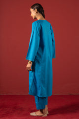 Self-embroidered classic fit paneled kurta with a round neckline and V-slit. Paired with classic straight-fit trousers.