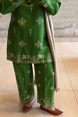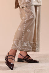 Embroidered classic-fit shirt with a round neckline and V-slit, adorned with delicate tassel detailing. Paired with embroidered culottes for a coordinated, refined look.