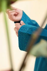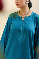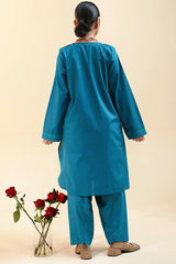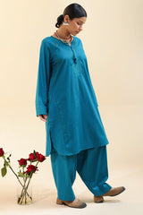 Textured classic-fit paneled shirt featuring self-embroidered detailing along the neckline and sleeve hems, accented with tassel detailing along the front slit. Finished with a rounded shirt hem. Paired with a textured classic-fit shalwar.