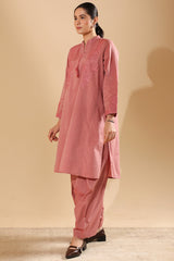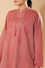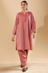 Embroidered textured paneled shirt with a low band neckline and tassel detailing along the V-slit. Paired with a textured classic-fit shalwar for a refined, coordinated look.
